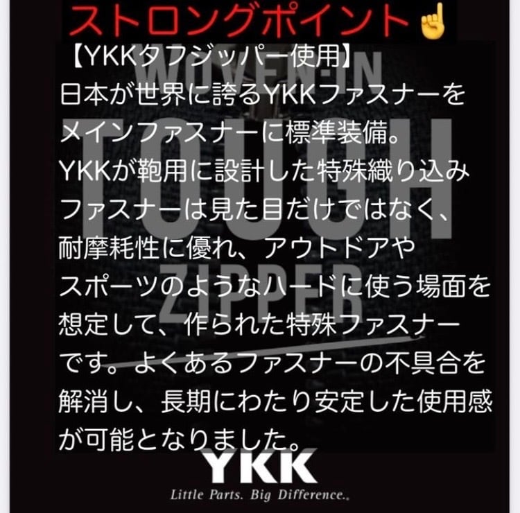 日本が世界に誇るYKKファスナーをメインファスナーに標準装備。