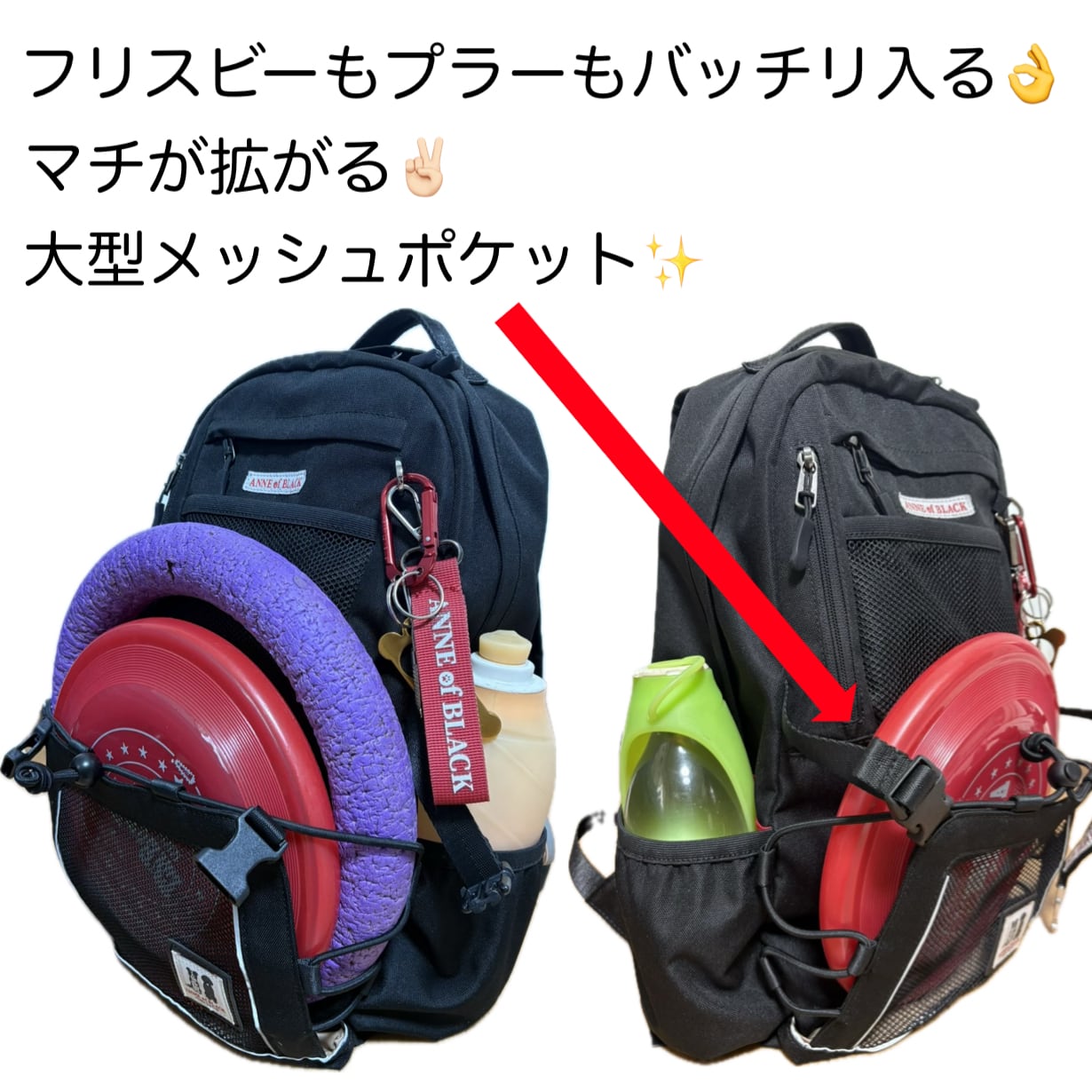 正面下部のメッシュポケットにはディスク(フリスビー)が楽々3枚~5枚。プラーも入ります。