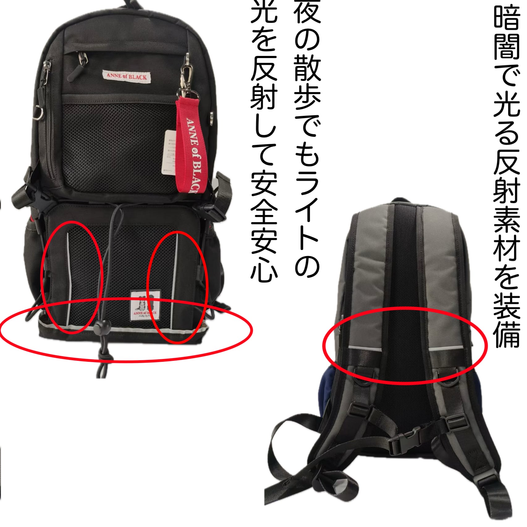 リュックの前、ショルダーベルトには暗闇で光る反射素材を装備。