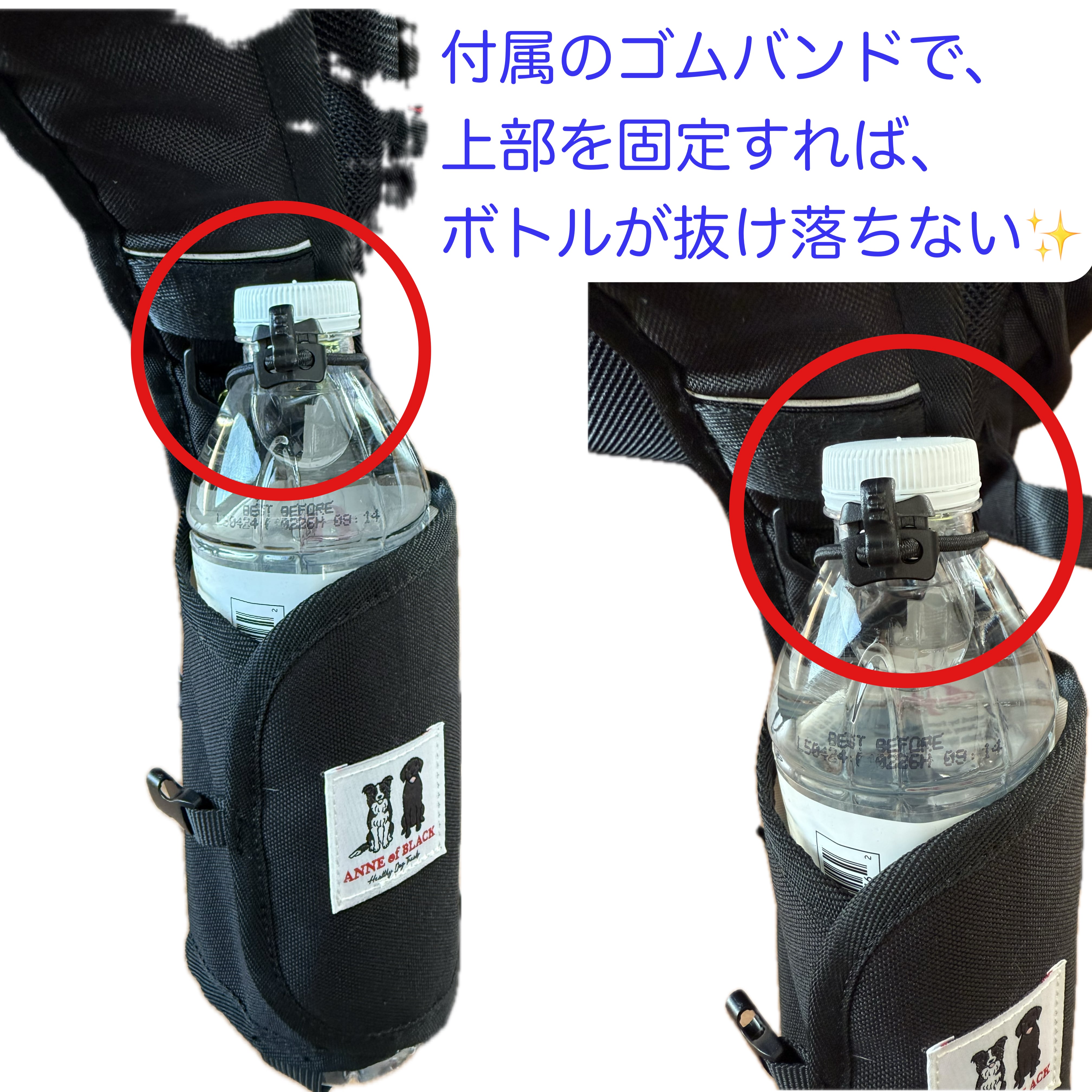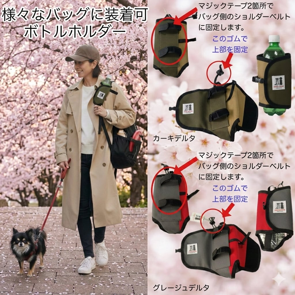 マジックテープ部分を広く取っているから、太めのボトルや水筒にも対応。ボトルのサイズによって柔軟に対応。