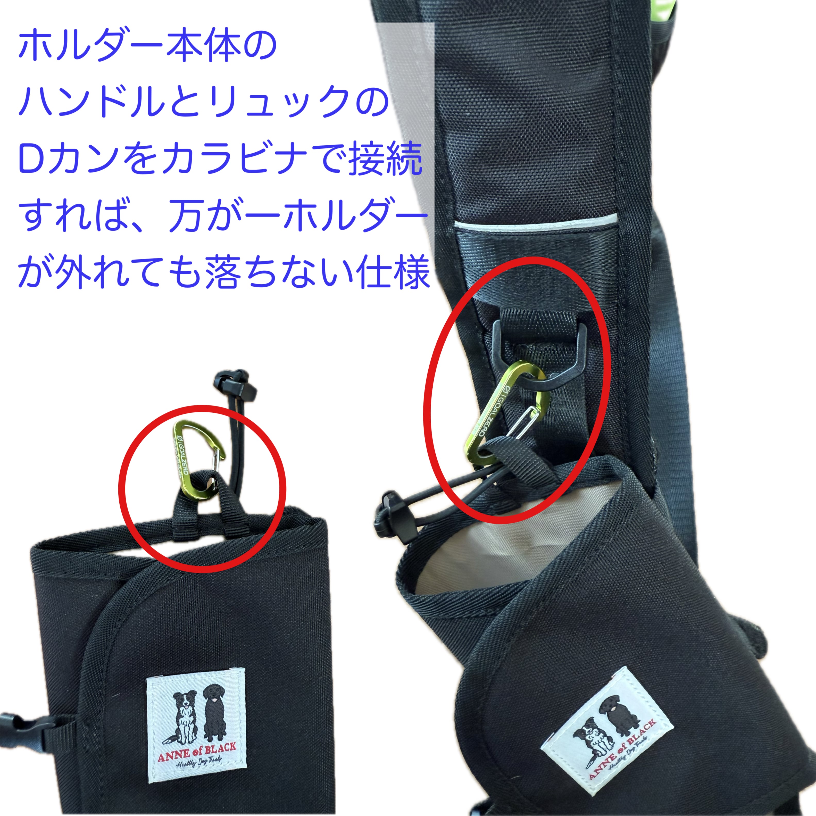 上部のハンドルにカラビナを付けて、リュックのショルダーベルトのDカンに接続すれば、下にズレずに使用出来る。