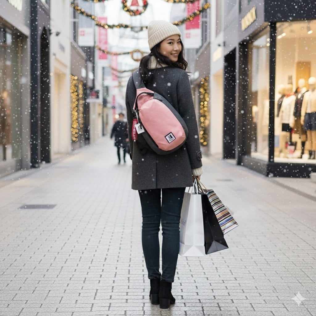 バッグを肩から掛けた時に、バッグの重心が身体の真ん中に来るように設計していますので、掛けた感覚が思った以上に楽に感じます。掛けたバッグが軽く感じられます。